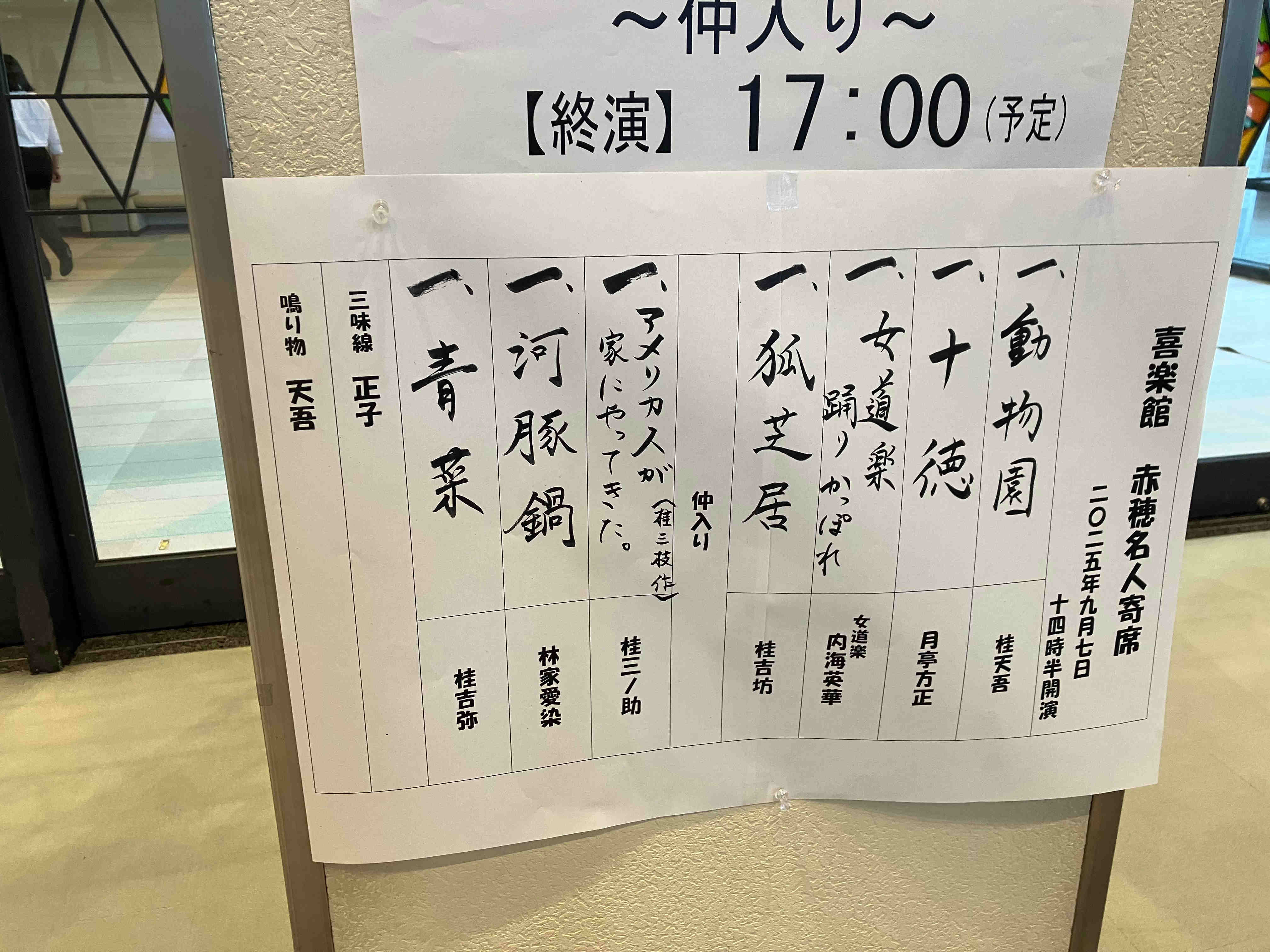 林家愛染:ふぐ鍋 明石の出身やけど、赤穂ゆかりの人らしい(三遊亭愛楽と勘違い。ラブリーと呼んでというあいさつだったので)。この程度で赤穂ゆかりと言うのなら、樫本大進さんおし