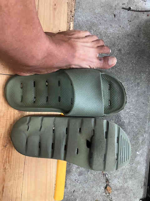 横一文字のやけど残り(上と中の対応:親指は、ゴムとすれてかさぶた)と、今年の6月に買ったサンダルが、ダイエットして薄くなって穴の開いた靴底(下:母指球と土踏まずの境目あたり)。