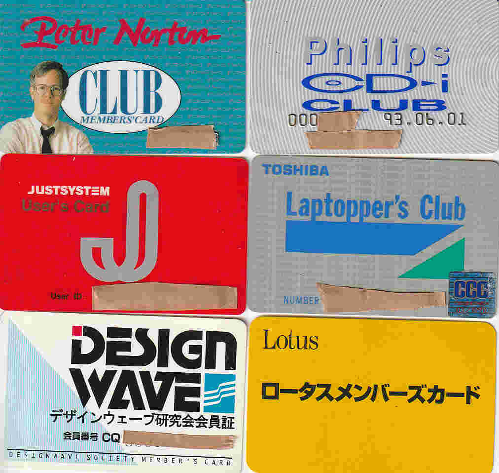 右下:今表計算といえばエクセルでしょうけど、ロータス123にお世話に。windows3.1で日本語エクセル初版かったけど、遅くてだめ。かなり後までDOS版123から離れられず。windows95でたときに、初代ペンティアムのAT互換機(DOS/V)でようやく乗り換えの踏ん切り付いた。このカードは、Thinkpad添付ソフトののオーガナイザーとかについてたものかな?用途不明