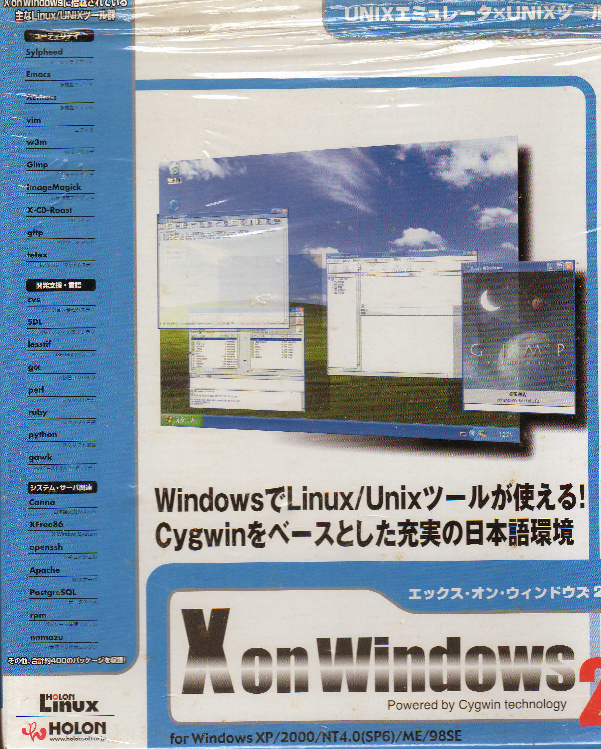 で、unixのテキストツール群が便利なので、ASCII者のtoolsというのを使っていたんですが、windowsが始まって、いろいろエディタ含めて都合わるい。win3.1,win95は、ASCIIのBOW(BSD on windows)つかってたので、win95の後かな? chgwinという、msdosベースのPC上で動くエミュレータ上のコマンドが面倒なので見つけたのが、XonWindows(旧Holon Linux)。とその継続のXonWindows2。
