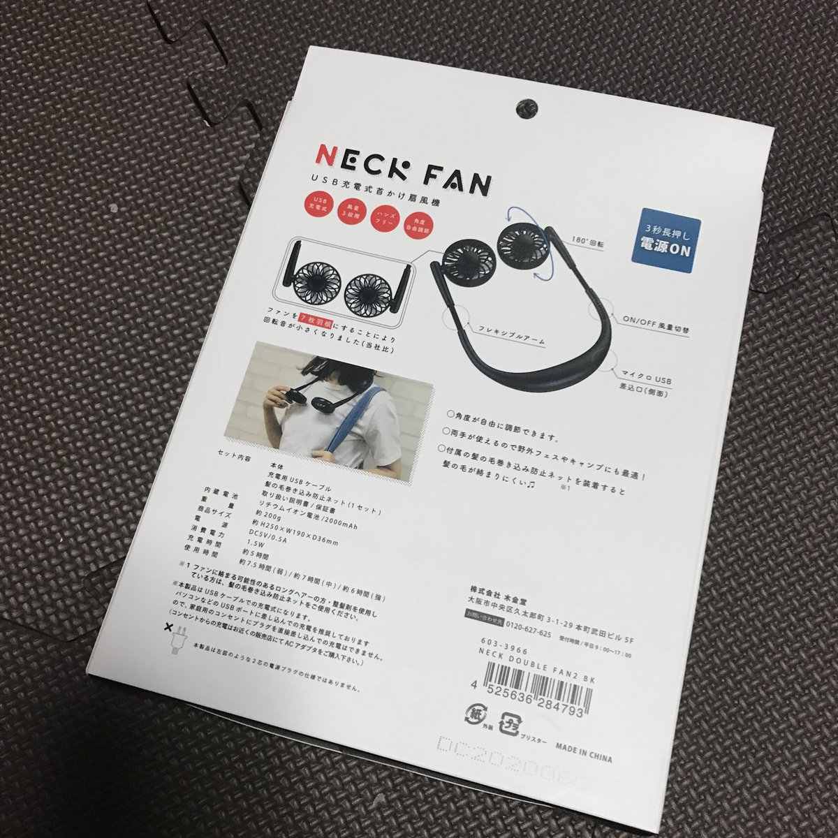 首にU字わっかをぶら下げる。U字の先端部分に左右二つのファン。