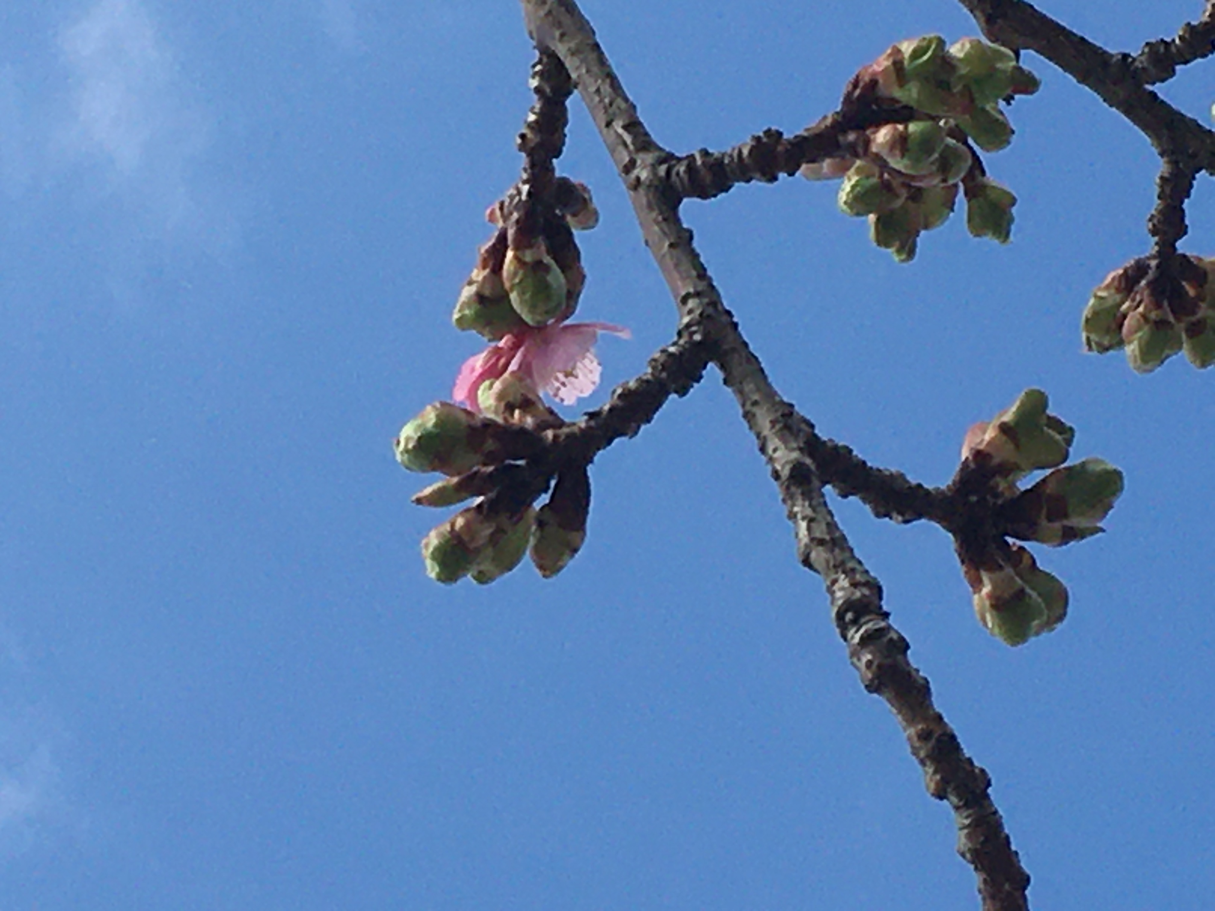 数本並んだ桜の、ある一本(駐車場横2本目)で、開花一輪と、つぼみからまだ開いてない花びら閉じたままのが数点。探しても見つけにくいと思います。ほかの木一応見たんだけど、開花はみつけられず。