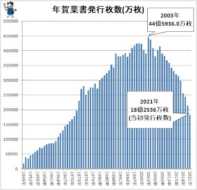 年賀状の発売が駄々下がり。電子メールやSNSの代用が人気のためらしい。