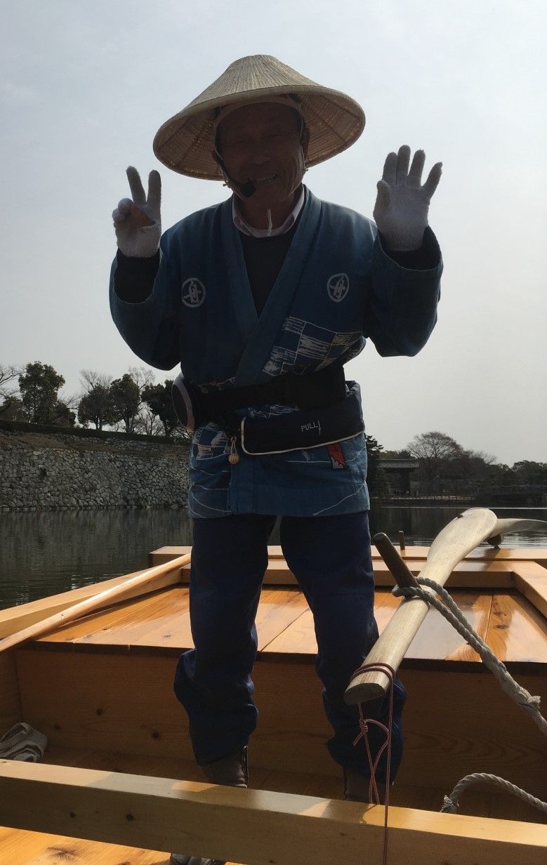 まず姫路城なのですが、大手前駐車場から堀沿いにあるくと、和船クルージングの案内。まもなく第一回目の9:30出発というので、申し込む。先客2組含め、3組6名で出発。